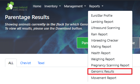 You will need to log into your Sheep Ireland account, click on the Reports tab followed by “Genomic Results” from the drop-down menu.