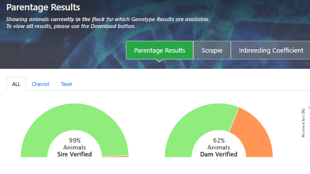 This is the default screen you’ll see when accessing the genomic results. Within this screen, you can analyse if the animals you have genotyped in your flocks were done so successfully and if and where any issues arose with your DNA samples, those issues will appear here. Where animals have successfully been genotyped and verified to parents these will appear here also.