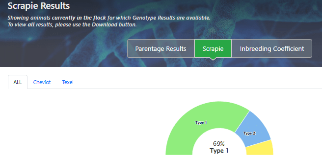 To view scrapie results select the “Scrapie” tab at the top of the genomic results screen. The scrapie type will be displayed for each animal in the 7th column of the table. Any animal that is sire verified and scrapie type 1/2/3 is eligible for the Sheep Improvement Scheme. Animals that are scrapie type 4/5 are not eligible.