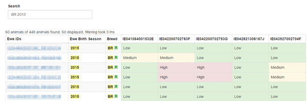 Image 1; example of inbreeding checker, on the right hand side where boxes are green with ‘low’ stated, this indicates that there is a low chance of the ram being related to the ewe. Yellow boxes stating ‘medium’ indicated a medium chance and the red stating ‘high’ indicates a very high chance of the ram being related to that particular ewe.
