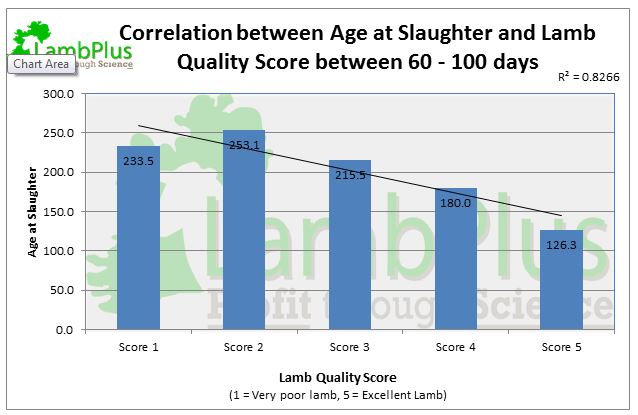 In 2016 a lamb quality score (LQS) was collected on over 2000 central progeny test lambs when they were between 60 -100 days of off age. The LQS is a visual appreciation of the overall quality of the lamb (score 1 = poor quality to 5 = excellent) by the farmer and takes multiple traits into account including weight, size, confirmation, and length of the animal as well as overall lamb carcass quality. Those lambs were then followed through to slaughter and their age at that point was recorded.