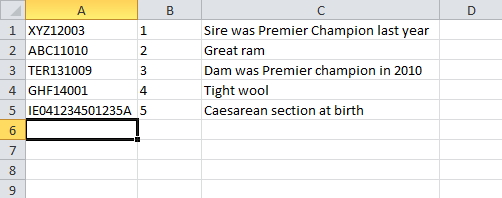 See below for an example of how to construct your excel list. Please do not use any headings. Simply enter the animal ID into the first column A. Enter the animal lot number into column B. Enter the animal comment (not necessary) into column C.