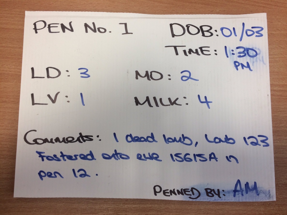 - All data is recorded through a handheld device which is sent to the Sheep Ireland database a number of times daily. As each ewe lambs, she is penned with her lambs in an individual pen, where all required data is recorded immediately on a pen board (see below). This data is then subsequently entered into the handheld recording device as lambs are EID tagged.