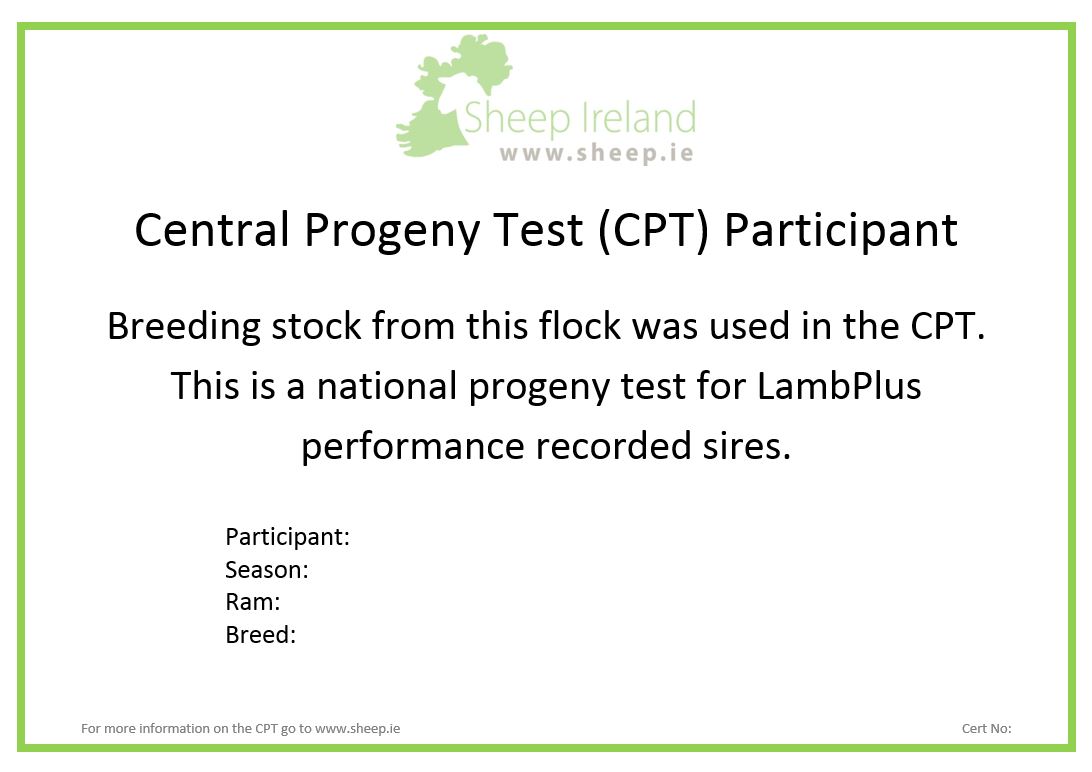 All breeders have received a letter this week letting them know how their ram performed throughout the CPT. Also as part of our ongoing effort to try and promote the CPT and help the farmers that are involved in the programme, we have developed a cert that breeders can display at shows and sales. This certificate shows that breeders had a stock ram involved in Sheep Ireland’s national progeny test programme. Please see example of certificate.