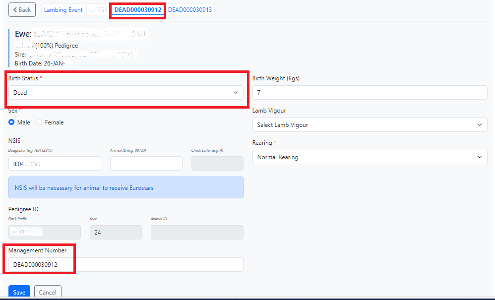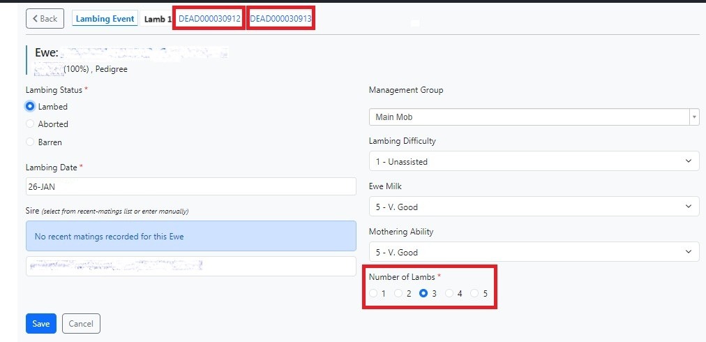 This ewe had triplets, one alive and two dead. The 3 lambs should be recorded. The system will assign a number to the dead ones, and there is no need to add any ID information. You should still record the weights.